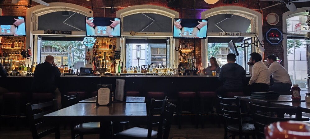 Irish pub with exposed brick, multiple large-screen TVs, indoor/outdoor seating & late-night eats.